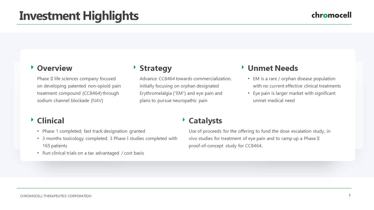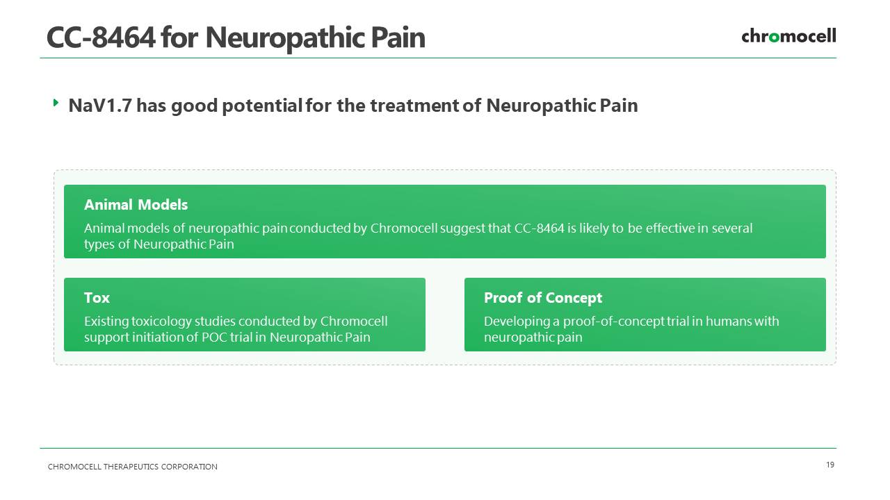 CHROMOCELL THERAPEUTICS CORPORATION 19 CC - 8464 for Neuropathic Pain Animal Models Animal models of neuropathic pain conducted by Chromocell suggest that CC - 8464 is likely to be effective in several types of Neuropathic Pain NaV1.7 has good potential for the treatment of Neuropathic Pain Tox Existing toxicology studies conducted by Chromocell support initiation of POC trial in Neuropathic Pain Proof of Concept Developing a proof - of - concept trial in humans with neuropathic pain