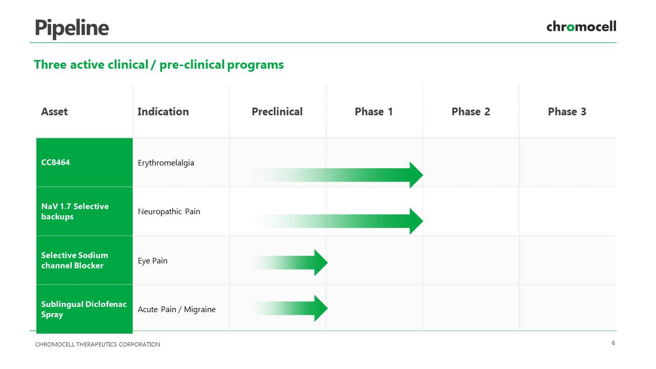 CHROMOCELL THERAPEUTICS CORPORATION 5 Investment Highlights Overview Phase II life sciences company focused on developing patented non - opioid pain treatment compound (CC8464) through sodium channel blockade (NAV) Strategy Advance CC8464 towards commercialization, initially focusing on orphan designated Erythromelalgia (“EM”) and eye pain and plans to pursue neuropathic pain Unmet Needs • EM is a rare / orphan disease population with no current effective clinical treatments • Eye pain is larger market with significant unmet medical need Clinical • Phase 1 completed; fast track designation granted • 3 months toxicology completed; 3 Phase I studies completed with 165 patients • Run clinical trials on a tax advantaged / cost basis Catalysts Use of proceeds for the offering to fund the dose escalation study, in vivo studies for treatment of eye pain and to ramp up a Phase II proof - of - concept study for CC8464.