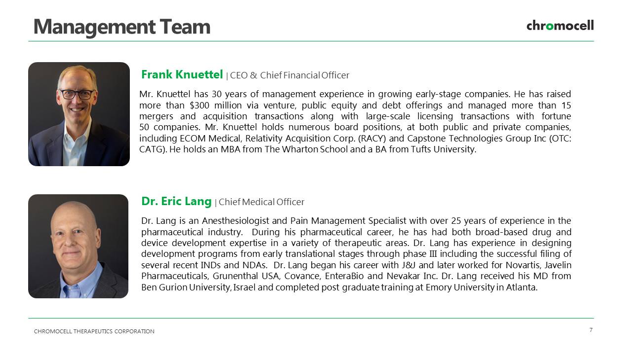 CHROMOCELL THERAPEUTICS CORPORATION 7 Management Team Frank Knuettel | CEO & Chief Financial Officer Mr . Knuettel has 30 years of management experience in growing early - stage companies . He has raised more than $ 300 million via venture, public equity and debt offerings and managed more than 15 mergers and acquisition transactions along with large - scale licensing transactions with fortune 50 companies . Mr . Knuettel holds numerous board positions, at both public and private companies, including ECOM Medical, Relativity Acquisition Corp . (RACY) and Capstone Technologies Group Inc (OTC : CATG) . He holds an MBA from The Wharton School and a BA from Tufts University . Dr. Eric Lang | Chief Medical Officer Dr . Lang is an Anesthesiologist and Pain Management Specialist with over 25 years of experience in the pharmaceutical industry . During his pharmaceutical career, he has had both broad - based drug and device development expertise in a variety of therapeutic areas . Dr . Lang has experience in designing development programs from early translational stages through phase III including the successful filing of several recent INDs and NDAs . Dr . Lang began his career with J&J and later worked for Novartis, Javelin Pharmaceuticals, Grunenthal USA, Covance, EnteraBio and Nevakar Inc . Dr . Lang received his MD from Ben Gurion University, Israel and completed post graduate training at Emory University in Atlanta .