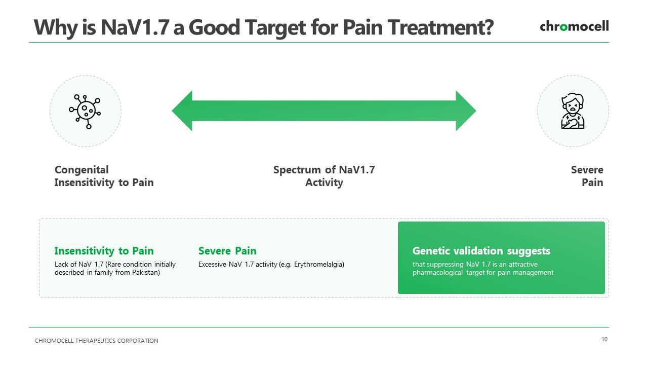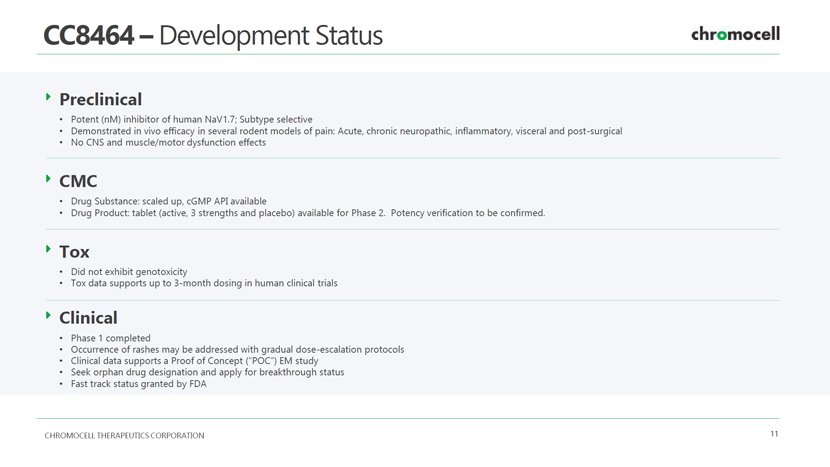 CHROMOCELL THERAPEUTICS CORPORATION 10 Why is NaV1.7 a Good Target for Pain Treatment? Insensitivity to Pain Lack of NaV 1.7 (Rare condition initially described in family from Pakistan) Severe Pain Excessive NaV 1.7 activity (e.g. Erythromelalgia) Genetic validation suggests that suppressing NaV 1.7 is an attractive pharmacological target for pain management Congenital Insensitivity to Pain Spectrum of NaV1.7 Activity Severe Pain