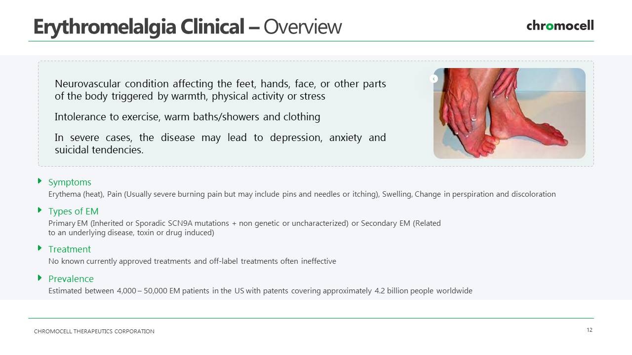 CHROMOCELL THERAPEUTICS CORPORATION 12 Erythromelalgia Clinical – Overview Symptoms Erythema (heat), Pain (Usually severe burning pain but may include pins and needles or itching), Swelling, Change in perspira tio n and discoloration Types of EM Primary EM (Inherited or Sporadic SCN9A mutations + non genetic or uncharacterized) or Secondary EM (Related to an underlying disease, toxin or drug induced) Treatment No known currently approved treatments and off - label treatments often ineffective Prevalence Estimated between 4,000 – 50,000 EM patients in the US with patents covering approximately 4.2 billion people worldwide Neurovascular condition affecting the feet, hands, face, or other parts of the body triggered by warmth, physical activity or stress Intolerance to exercise, warm baths/showers and clothing In severe cases, the disease may lead to depression, anxiety and suicidal tendencies .
