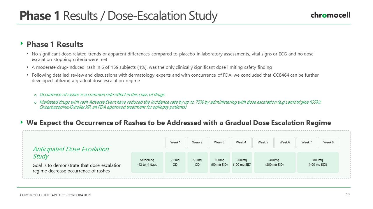 CHROMOCELL THERAPEUTICS CORPORATION 13 Phase 1 Results / Dose - Escalation Study Phase 1 Results • No significant dose related trends or apparent differences compared to placebo in laboratory assessments, vital signs or ECG and no dose escalation stopping criteria were met • A moderate drug - induced rash in 6 of 159 subjects (4%), was the only clinically significant dose limiting safety finding • Following detailed review and discussions with dermatology experts and with concurrence of FDA, we concluded that CC8464 can be further developed utilizing a gradual dose escalation regime o Occurrence of rashes is a common side effect in this class of drugs o Marketed drugs with rash Adverse Event have reduced the incidence rate by up to 75% by administering with dose escalation ( e.g Lamotrigine (GSK); Oxcarbazepine/ Oxtellar XR, an FDA approved treatment for epilepsy patients) Anticipated Dose Escalation Study Goal is to demonstrate that dose escalation regime decrease occurrence of rashes Screening - 42 to - 1 days 25 mg QD 50 mg QD 100mg (50 mg BID) 200 mg (100 mg BID) 400mg (200 mg BID) 800mg (400 mg BID) Week 1 Week 2 Week 3 Week 8 Week 7 Week 6 Week 4 Week 5 We Expect the Occurrence of Rashes to be Addressed with a Gradual Dose Escalation Regime