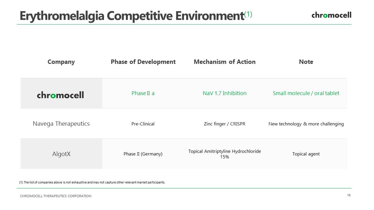 CHROMOCELL THERAPEUTICS CORPORATION 16 Erythromelalgia Competitive Environment (1) Company Phase of Development Mechanism of Action Note Phase II a NaV 1.7 Inhibition Small molecule / oral tablet Navega Therapeutics Pre - Clinical Zinc finger / CRISPR New technology & more challenging AlgotX Phase II (Germany) Topical Amitriptyline Hydrochloride 15% Topical agent ( 1 ) The list of companies above is not exhaustive and may not capture other relevant market participants .