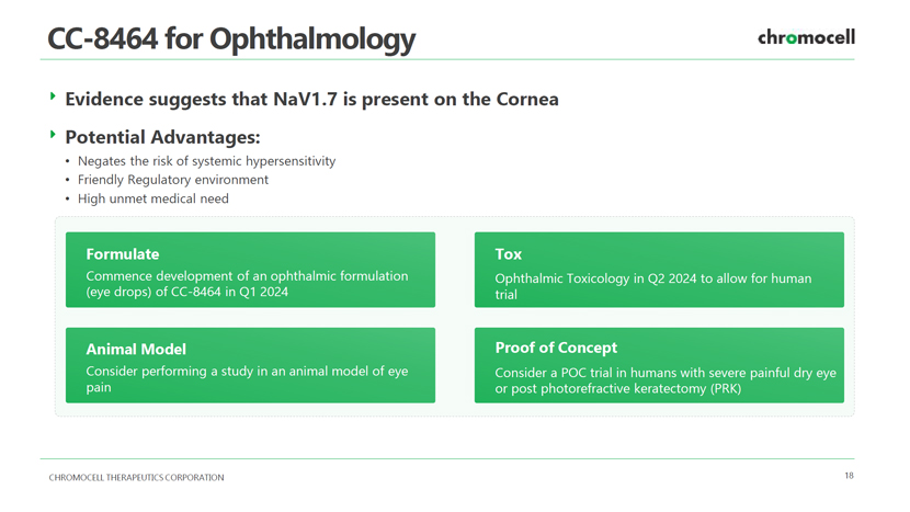 CHROMOCELL THERAPEUTICS CORPORATION 18 CC - 8464 for Ophthalmology Formulate Commence development of an ophthalmic formulation (eye drops) of CC - 8464 in Q1 2024 Potential Advantages: • Negates the risk of systemic hypersensitivity • Friendly Regulatory environment • High unmet medical need Evidence suggests that NaV1.7 is present on the Cornea Animal Model Consider performing a study in an animal model of eye pain Tox Ophthalmic Toxicology in Q2 2024 to allow for human trial Proof of Concept Consider a POC trial in humans with severe painful dry eye or post photorefractive keratectomy (PRK)