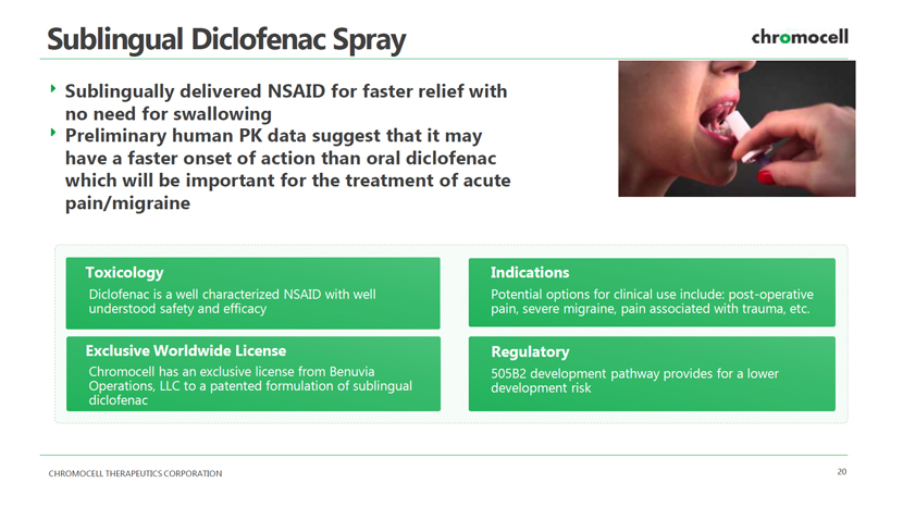 CHROMOCELL THERAPEUTICS CORPORATION 20 Sublingual Diclofenac Spray Toxicology Diclofenac is a well characterized NSAID with well understood safety and efficacy Sublingually delivered NSAID for faster relief with no need for swallowing Exclusive Worldwide License Chromocell has an exclusive license from Benuvia Operations, LLC to a patented formulation of sublingual diclofenac Regulatory 505B2 development pathway provides for a lower development risk Preliminary human PK data suggest that it may have a faster onset of action than oral diclofenac which will be important for the treatment of acute pain/migraine Indications Potential options for clinical use include: post - operative pain, severe migraine, pain associated with trauma, etc.