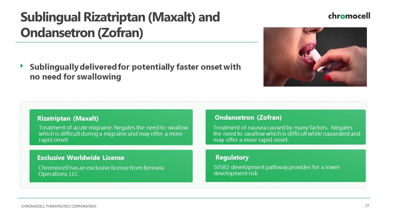 CHROMOCELL THERAPEUTICS CORPORATION 21 Sublingual Rizatriptan (Maxalt) and Ondansetron (Zofran) Rizatriptan (Maxalt) Treatment of acute migraine. Negates the need to swallow which is difficult during a migraine and may offer a more rapid onset. Sublingually delivered for potentially faster onset with no need for swallowing Exclusive Worldwide License Chromocell has an exclusive license from Benuvia Operations, LLC Regulatory 505B2 development pathway provides for a lower development risk Ondansetron (Zofran) Treatment of nausea caused by many factors. Negates the need to swallow which is difficult while nauseated and may offer a more rapid onset.