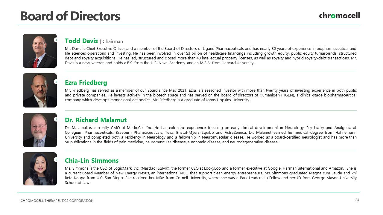 CHROMOCELL THERAPEUTICS CORPORATION 23 Board of Directors Todd Davis | Chairman Mr . Davis is Chief Executive Officer and a member of the Board of Directors of Ligand Pharmaceuticals and has nearly 30 years of experience in biopharmaceutical and life sciences operations and investing . He has been involved in over $ 3 billion of healthcare financings including growth equity, public equity turnarounds, structured debt and royalty acquisitions . He has led, structured and closed more than 40 intellectual property licenses, as well as royalty and hybrid royalty - debt transactions . Mr . Davis is a navy veteran and holds a B . S . from the U . S . Naval Academy and an M . B . A . from Harvard University . Ezra Friedberg Mr . Friedberg has served as a member of our Board since May 2021 . Ezra is a seasoned investor with more than twenty years of investing experience in both public and private companies . He invests actively in the biotech space and has served on the board of directors of Humanigen (HGEN), a clinical - stage biopharmaceutical company which develops monoclonal antibodies . Mr . Friedberg is a graduate of Johns Hopkins University . Dr. Richard Malamut Dr . Malamut is currently CMO at MedinCell Inc . He has extensive experience focusing on early clinical development in Neurology, Psychiatry and Analgesia at Collegium Pharmaceuticals, Braeburn Pharmaceuticals, Teva, Bristol - Myers Squibb and AstraZeneca . Dr . Malamut earned his medical degree from Hahnemann University and completed both a residency in Neurology and a fellowship in Neuromuscular disease . He worked as a board - certified neurologist and has more than 50 publications in the fields of pain medicine, neuromuscular disease, autonomic disease, and neurodegenerative disease . Chia - Lin Simmons Ms . Simmons is the CEO of LogicMark , Inc . (Nasdaq : LGMK), the former CEO at LookyLoo and a former executive at Google, Harman International and Amazon . She is a current Board Member of New Energy Nexus, an international NGO that support clean energy entrepreneurs . Ms . Simmons graduated Magna cum Laude and Phi Beta Kappa from U . C . San Diego . She received her MBA from Cornell University, where she was a Park Leadership Fellow and her JD from George Mason University School of Law .