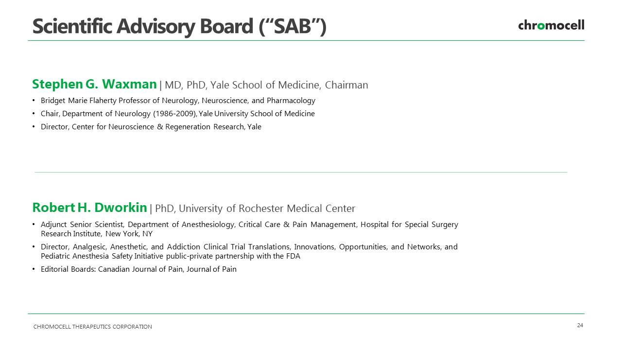 CHROMOCELL THERAPEUTICS CORPORATION 24 Scientific Advisory Board (“SAB”) Stephen G. Waxman | MD, PhD, Yale School of Medicine, Chairman • Bridget Marie Flaherty Professor of Neurology, Neuroscience, and Pharmacology • Chair, Department of Neurology ( 1986 - 2009 ), Yale University School of Medicine • Director, Center for Neuroscience & Regeneration Research, Yale Robert H. Dworkin | PhD, University of Rochester Medical Center • Adjunct Senior Scientist, Department of Anesthesiology, Critical Care & Pain Management, Hospital for Special Surgery Research Institute, New York, NY • Director, Analgesic, Anesthetic, and Addiction Clinical Trial Translations, Innovations, Opportunities, and Networks, and Pediatric Anesthesia Safety Initiative public - private partnership with the FDA • Editorial Boards : Canadian Journal of Pain, Journal of Pain