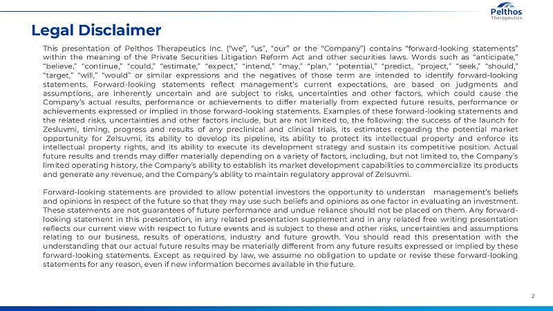 Legal Disclaimer This presentation of Pelthos Therapeutics Inc. (“we”, “us”, “our” or the “Company”) contains “forward-looking statements” within the meaning of the Private Securities Litigation Reform Act and other securities laws. Words such as “anticipate,” “believe,” “continue,” “could,” “estimate,” “expect,” “intend,” “may,” “plan,” “potential,” “predict, “project,” “seek,” “should,” “target,” “will,” “would” or similar expressions and the negatives of those term are intended to identify forward-looking statements. Forward-looking statements reflect management’s current expectations, are based on judgments and assumptions, are inherently uncertain and are subject to risks, uncertainties and other factors, which could cause the Company’s actual results, performance or achievements to differ materially from expected future results, performance or achievements expressed or implied in those forward-looking statements. Examples of these forward-looking statements and the related risks, uncertainties and other factors include, but are not limited to, the following: the success of the launch for Zesluvmi, timing, progress and results of any preclinical and clinical trials, its estimates regarding the potential market opportunity for Zelsuvmi, its ability to develop its pipeline, its ability to protect its intellectual property and enforce its intellectual property rights, and its ability to execute its development strategy and sustain its competitive position. Actual future results and trends may differ materially depending on a variety of factors, including, but not limited to, the Company’s limited operating history, the Company’s ability to establish its market development capabilities to commercialize its products and generate any revenue, and the Company’s ability to maintain regulatory approval of Zelsuvmi. Forward-looking statements are provided to allow potential investors the opportunity to understan management’s beliefs and opinions in respect of the future so that they may use such beliefs and opinions as one factor in evaluating an investment. These statements are not guarantees of future performance and undue reliance should not be placed on them. Any forward-looking statement in this presentation, in any related presentation supplement and in any related free writing presentation reflects our current view with respect to future events and is subject to these and other risks, uncertainties and assumptions relating to our business, results of operations, industry and future growth. You should read this presentation with the understanding that our actual future results may be materially different from any future results expressed or implied by these forward-looking statements. Except as required by law, we assume no obligation to update or revise these forward-looking statements for any reason, even if new information becomes available in the future. 2