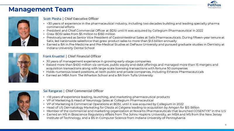 Corporate Profile Pelthos Therapeutics is a bio-pharmaceutical company committed to commercializing innovative, safe, and efficacious therapeutic products to help patients with unmet treatment burdens Commercial launch of first drug Zelsuvmi, for the treatment of Molluscum contagiosum (“MC”) in July 2025 First and only at home treatment for a large, underserved market treating contagious viral disease 16.7 million affected people Up to 6 million annual cases in the U.S. Total addressable market worth in excess of $20 billion at our WAC Experienced management team with over 20 successful prior drug launches and continued growth, including Cosentyx, Otezla, Ohtuvayre, Xifaxan Upside option on NaV pain programs from predecessor Current peak Net Revenue forecast of $175M per annum by 2028 and currently meeting or exceeding internal milestones Key Data Points (as of 08/29/25, except where noted) Ticker PTHS Stock Price $23.65 O/S Shares of 8.8M Common Stock (on an as converted basis)* Market CAP ~$205M Avg. Daily 59000 shares 12,300 shares Trading Volume Cash at close of $27.5M merger Investment to >$400M date 3