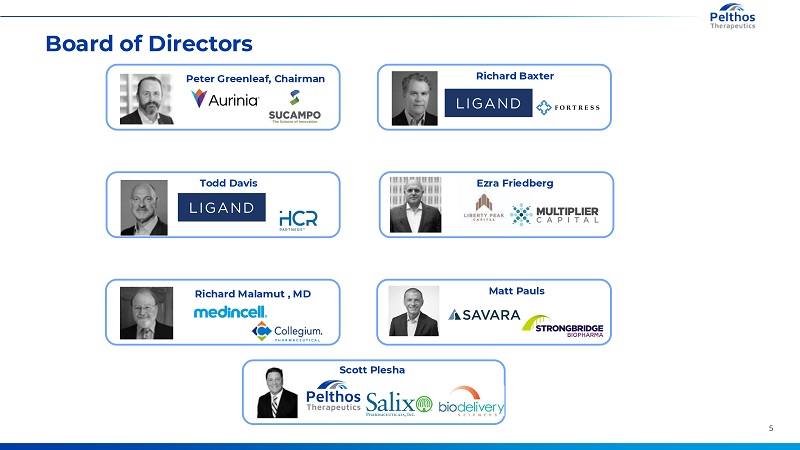 Management Team Scott Plesha | Chief Executive Officer • >30 years of experience in the pharmaceutical industry, including two decades building and leading specialty pharma commercial efforts • President and Chief Commercial Officer at BDSI until it was acquired by Collegium Pharmaceutical in 2022 • Grew BDSI sales from $5 million to $160 million • Previously served as Senior Vice President of Gastrointestinal Sales at Salix Pharmaceuticals. During fifteen-year tenure at Salix, led nationwide salesforce that grew product sales to more than $1.5 billion annually • Earned a BA in Pre-Medicine and Pre-Medical Studies at DePauw University and pursued graduate studies in Dentistry at Indiana University Dental School Frank Knuettel | Chief Financial Officer • 30 years of management experience in growing early-stage companies • Raised more than $400 million via venture, public equity and debt offerings and managed more than 15 mergers and acquisition transactions along with large-scale licensing transactions with fortune 50 companies • Holds numerous board positions, at both public and private companies, including Etheros Pharmaceuticals • Earned an MBA from The Wharton School and a BA from Tufts University Sai Rangarao | Chief Commercial Officer • >18 years of experience leading, launching, and marketing pharmaceutical products • VP of Marketing & Head of Neurology Sales at Collegium Pharmaceutical • VP of Marketing & Commercial Operations at BDSI, until it was acquired by Collegium in 2022 • Head of US Dermatology Marketing for Otezla at Celgene leading to acquisition by Amgen for $13 Billion • Member of the commercial and marketing organization at Novartis Pharmaceuticals that launched COSENTYX® in the U.S • Earned an MS in Bioscience Regulatory Affairs from The Johns Hopkins University, an MBA and MS from the New Jersey Institute of Technology, and a BS in Computer Science from Indiana University of Pennsylvania 4