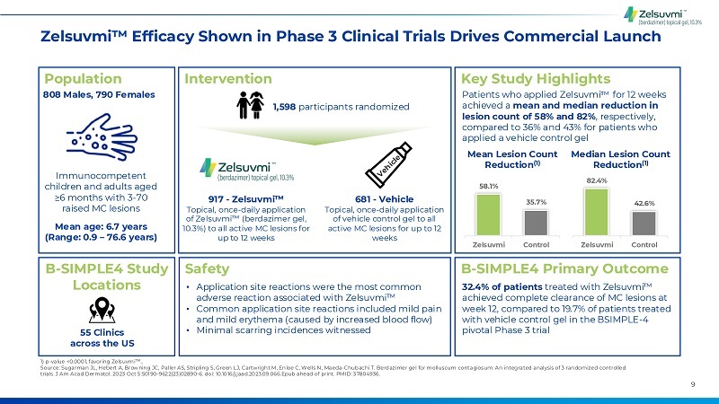 8 Zelsuvmi Has the Potential to Shift MC Treatment Paradigm Zelsuvmi Current Options Painful, destructive treatments3 Attractive safety profile demonstrated in clinical trials with no / minimal scarring5,6 Remaining treatment options such as off-label drugs / natural remedies have unproven efficacy4 Demonstrated, proven efficacy across key primary and secondary endpoints in clinical trials6 Necessitates travel to HCP offices, adding to the time burden for MC patients and caregivers2 First FDA approved medication for molluscum that can be applied at home by patients or caregivers5 Other available topical treatment requires in-office visits every 3 weeks2 Daily application that can be started immediately 58.1% Mean MC Lesion reduction count(1) Breakthrough Product, Breakthrough Results 1.)Least-squares mean count reduction. See Figure 9: Browning JC, Hebert A, Enloe C, Cartwright M, Maeda-Chubachi T. Berdazimer Gel 10.3% is a Clinically Meaningful Therapeutic Intervention for Molluscum Contagiosum. Abstract and poster presented at Fall Clinical 2024. Las Vegas, NV. October 24-27, 2024. 2.) Eichenf ield LF, Kwong P, Gonzalez ME, et al. Safety and Efficacy of VP-102 (Cantharidin, 0.7% w/v) in Molluscum Contagiosum by Body Region: Post hoc Pooled Analyses from Two Phase III Randomized Trials. J Clin Aesthet Dermatol. 2021;14(10):42-47. 3.) Hebert AA, Bhatia N, Del Rosso JQ. Molluscum Contagiosum: Epidemiology, Considerations, Treatment Options, and Therapeutic Gaps. J Clin Aesthet Dermatol. 2023;16(8 Suppl 1):S4-S11. 4.) Ong SK, Hoft I, Siegfried E. Analysis of over-the-counter products marketed to treat molluscum contagiosum. Pediatr Dermatol. 2021;38(5):1400-1403. doi:10.1111/pde.14776. 5.) Zelsuvmi Package Insert. 6.) Sugarman JL, Hebert A, Browning JC, et al. Berdazimer gel for molluscum contagiosum: An integrated analysis of 3 randomized controlled trials. J Am Acad Dermatol. 2024;90(2):299-308. doi:10.1016/j.jaad.2023.09.066Ong