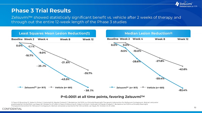 10 CONFIDENTIAL Baseline Week 2 Week 4 0.0% -1.1 % -43.5% Week 8 -35.7% Week 12 -59.4% -82.4% -42.6% -10.7% - 25 .1% -9.0% -21 .6% - 58 .1% Baseline Week 2 Week 4 0.0% 0.0% -9.5% -10.0% -28.6% -27.8% Week 8 Week 12 Phase 3 Trial Results 1) Figure 9: Browning JC, Hebert A, Enloe C, Cartwright M, Maeda-Chubachi T. Berdazimer Gel 10.3% is a Clinically Meaningful Therapeutic Intervention for Molluscum Contagiosum. Abstract and poster presentedatFall Clinical 2024. Las Vegas, NV. October 24-27, 2024. 2) Figure 10: Browning JC, Hebert A, Enloe C, Cartwright M, Maeda-Chubachi T. Berdazimer Gel 10.3% is a Clinically Meaningful TherapeuticIntervention for Molluscum Contagiosum. Abstract and poster presented at Fall Clinical 2024. Las Vegas, NV. October 24-27, 2024. Least Squares Mean Lesion Reduction(1) P<0.0001 at all time points, favoring Zelsuvmi Median Lesion Reduction TM (2) Zelsuvmi (n= 917) Vehicle (n= 681) Zelsuvmi showed statistically significant benefit vs. vehicle after 2 weeks of therapy and through out the entire 12-week length of the Phase 3 studies Zelsuvmi (n= 917) Vehicle (n= 681)