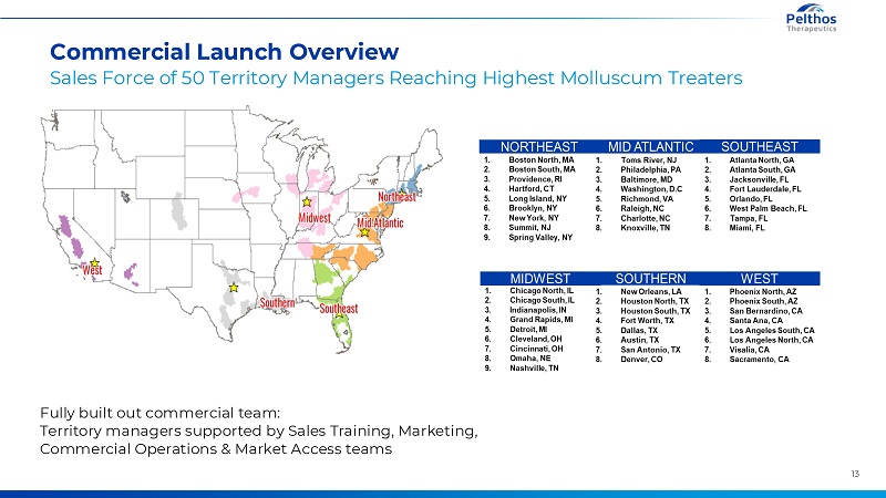 12 Activating Key Leverage Points Is Essential to Maximize the Commercial Potential of Zelsuvmi Addressable Patient Population Refills Treated Patients / Initial Prescriptions Price and Revenue 01 02 03 04 Key Leverage Points Up to 6 million new cases each year with an average untreated resolution time of 13 months, during which disease is highly contagious Treated patients respond well to Zelsuvmi and experience dramatic reduction in lesion count and mean time to resolution FDA approved for 12-week treatment regimen, but internal forecasts assume lower WAC of $1,950 per unit. Disclosed peak net revenues of $175M per annum by 2028
