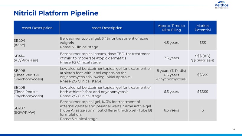 18 Nitricil Platform PipelineAsset Description Asset Description Approx Time to NDA Filing Market Potential SB204 (Acne) Berdazimer topical gel, 3.4% for treatment of acne vulgaris. Phase 3 Clinical stage. 4.5 years $$$ SB414 (AD/Psoriasis) Berdazimer topical cream, dose TBD, for treatment of mild to moderate atopic dermatitis. Phase 1/2 Clinical stage. 7.5 years $$$ (AD) $$ (Psoriasis) SB208 (Tinea Pedis -> Onychomycosis) Low alcohol berdazimer topical gel for treatment of athlete’s foot with label expansion for onychomycosis following initial approval. Phase 2/3 Clinical stage. 5 years (T. Pedis) 6.5 years (Onychomycosis) $$$$$ SB208 (Tinea Pedis + Onychomycosis) Low alcohol berdazimer topical gel for treatment of both athlete’s foot and onychomycosis. Phase 2/3 Clinical stage. 6.5 years $$$$$ SB207 (EGW/PAW) Berdazimer topical gel, 10.3% for treatment of external genital and perianal warts. Same active gel (Tube A) as Zelsuvmi but different hydrogel (Tube B) formulation. Phase 3 clinical stage. 6.5 years $