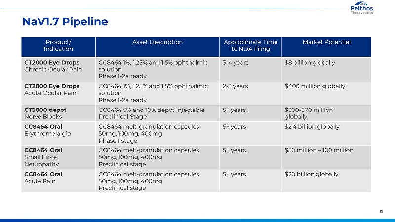 19 NaV1.7 PipelineProduct/ Indication Asset Description Approximate Time to NDA Filing Market Potential CT2000 Eye Drops Chronic Ocular Pain CC8464 1%, 1.25% and 1.5% ophthalmic solution Phase 1-2a ready 3-4 years $8 billion globally CT2000 Eye Drops Acute Ocular Pain CC8464 1%, 1.25% and 1.5% ophthalmic solution Phase 1-2a ready 2-3 years $400 million globally CT3000 depot Nerve Blocks CC8464 5% and 10% depot injectable Preclinical Stage 5+ years $300-570 million globally CC8464 Oral Erythromelalgia CC8464 melt-granulation capsules 50mg, 100mg, 400mg Phase 1 stage 5+ years $2.4 billion globally CC8464 Oral Small Fibre Neuropathy CC8464 melt-granulation capsules 50mg, 100mg, 400mg Preclinical stage 5+ years $50 million – 100 million CC8464 Oral Acute Pain CC8464 melt-granulation capsules 50mg, 100mg, 400mg Preclinical stage 5+ years $20 billion globally