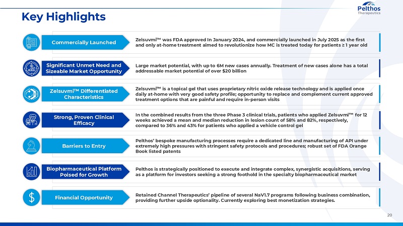 20 CONFIDENTIAL Key Highlights Strong, Proven Clinical Efficacy In the combined results from the three Phase 3 clinical trials, patients who applied Zelsuvmi for 12 weeks achieved a mean and median reduction in lesion count of 58% and 82%, respectively, compared to 36% and 43% for patients who applied a vehicle control gel Commercially Launched Zelsuvmi was FDA approved In January 2024, and commercially launched in July 2025 as the first and only at-home treatment aimed to revolutionize how MC is treated today for patients ≥ 1 year old Zelsuvmi Differentiated Characteristics Zelsuvmi is a topical gel that uses proprietary nitric oxide release technology and is applied once daily at-home with very good safety profile; opportunity to replace and complement current approved treatment options that are painful and require in-person visits Significant Unmet Need and Sizeable Market Opportunity Large market potential, with up to 6M new cases annually. Treatment of new cases alone has a total addressable market potential of over $20 billion Barriers to Entry Pelthos’ bespoke manufacturing processes require a dedicated line and manufacturing of API under extremely high pressures with stringent safety protocols and procedures; robust set of FDA Orange Book listed patents Financial Opportunity Retained Channel Therapeutics’ pipeline of several NaV1.7 programs following business combination, providing further upside optionality. Currently exploring best monetization strategies. Biopharmaceutical Platform Poised for Growth Pelthos is strategically positioned to execute and integrate complex, synergistic acquisitions, serving as a platform for investors seeking a strong foothold in the specialty biopharmaceutical market