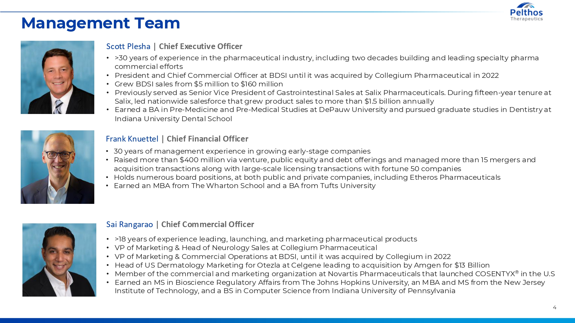 Corporate Profile Pelthos Therapeutics is a bio-pharmaceutical company committed to commercializing innovative, safe, and efficacious therapeutic products to help patients with unmet treatment burdens • • • • • Commercial launch of first drug Zelsuvmi, for the treatment of Molluscum contagiosum (“MC”) in July 2025 First and only at home treatment for a large, underserved market treating contagious viral disease ❖ 16.7 million affected people ❖ Up to 6 million annual cases in the U.S. ❖ Total addressable market worth in excess of $20 billion at our WAC Experienced management team with over 20 successful prior drug launches and continued growth, including Cosentyx, Otezla, Ohtuvayre, Xifaxan Upside option on NaV pain programs from predecessor Current peak Net Revenue forecast of $175M per annum by 2028 and currently meeting or exceeding internal milestones Key Data Points (as of 10/10/25, except where noted) Ticker PTHS Stock Price $23.26 O/S Shares of Common Stock (on an as converted basis)* 8.8M Market CAP ~$205M Avg. Daily Trading Volume 31,100 shares (NYSE) Cash at close of merger $27.5M Investment to date >$400M 3