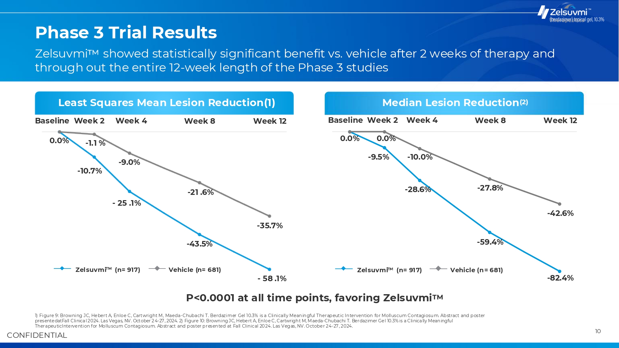 Zelsuvmi Efficacy Shown in Phase 3 Clinical Trials Drives Commercial Launch Population Intervention Key Study Highlights 808 Males, 790 Females 1,598 participants randomized Patients who applied Zelsuvmi for 12 weeks achieved a mean and median reduction in lesion count of 58% and 82%, respectively, compared to 36% and 43% for patients who applied a vehicle control gel Mean Lesion Count Reduction(1) Immunocompetent children and adults aged ≥6 months with 3-70 raised MC lesions Mean age: 6.7 years (Range: 0.9 – 76.6 years) B-SIMPLE4 Study Locations 55 Clinics across the US 82.4% 58.1% 917 - Zelsuvmi Topical, once-daily application of Zelsuvmi (berdazimer gel, 10.3%) to all active MC lesions for up to 12 weeks 681 - Vehicle Topical, once-daily application of vehicle control gel to all active MC lesions for up to 12 weeks Median Lesion Count Reduction(1) 35.7% Zelsuvmi Control 42.6% Zelsuvmi Control Safety B-SIMPLE4 Primary Outcome • Application site reactions were the most common adverse reaction associated with Zelsuvmi • Common application site reactions included mild pain and mild erythema (caused by increased blood flow) • Minimal scarring incidences witnessed 32.4% of patients treated with Zelsuvmi achieved complete clearance of MC lesions at week 12, compared to 19.7% of patients treated with vehicle control gel in the BSIMPLE-4 pivotal Phase 3 trial 1) p-value <0.000 1, f avoring Zelsuvmi .. Source: Sugarman JL, Hebert A, Brow nin g JC, Paller AS, Stripling S, Green LJ, Cartwrigh t M, Enloe C, W ells N, Maeda-Chubac hi T. Berd azimer gel for molluscum contagiosum: An integrated analysis of 3 randomized controlled trials. J Am Acad Dermatol. 20 23 Oct 5:S0190-9622(23)02890-6. doi: 10.10 16/j.jaad.20 23.09.066.Epub ahead of print. PMID: 37804936. 9